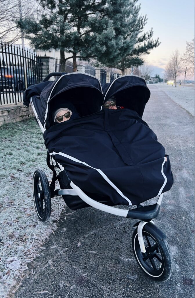 In the winter, it’s the extra thickness that provides just enough extra warmth and wind protection for a child who is otherwise either walking or warm in a tummy bag in winter clothes, so that when the child is sitting still in the stroller, when it might otherwise be cold, the stroller is still a nice warm nest for a sitting or sleeping child.