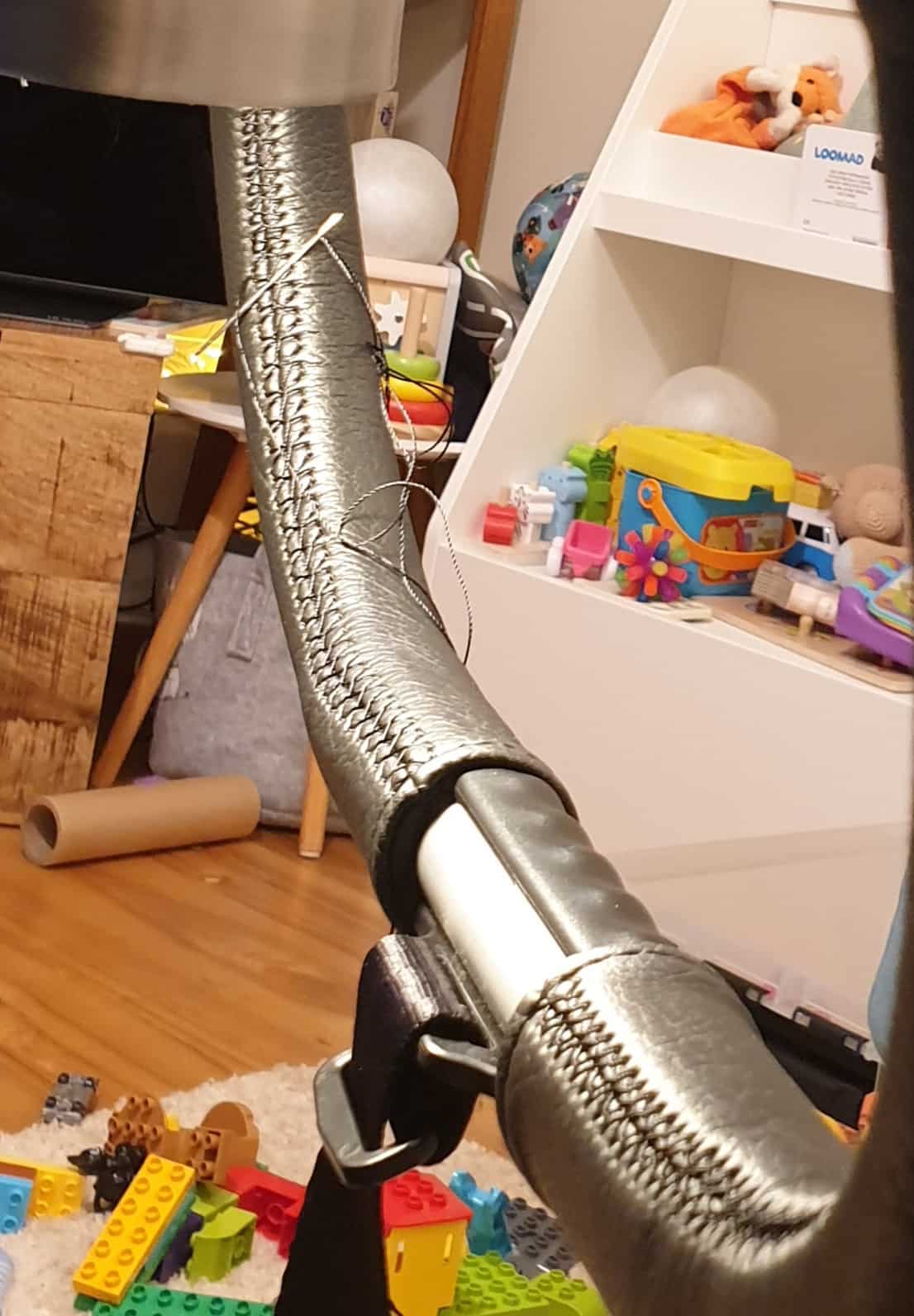 Triinu: “Tellisin mingiaeg oma cybex balios s kärule uued lükkesanga katted. Tükk aega võtsin hoogu, aga nüüd on lõpuks uued katted ka peale punutud. Mulineega sain hakkama nii, et mõlemale poole läks üks ära ning isegi topelt punumise suutsin ära selle ühega ära teha. Ühekordne ristpiste jäi kohati vähe lokkama(seal kus lükkesang paindesse läheb), seetõttu ka teistpidi tagasi tulin. Õmblemisoskus pole mul just eriliselt kiita, aga isegi minusugune kobakäpp sai täitsa hakkama. Lükkesang näeb välja nagu uus ning olen sellega nii rahul. Annab kärule kohe palju ilusama ning viisakama väljanägemise. Suur tänu ning mõnusat õmblemist Teile edaspidiseks.”