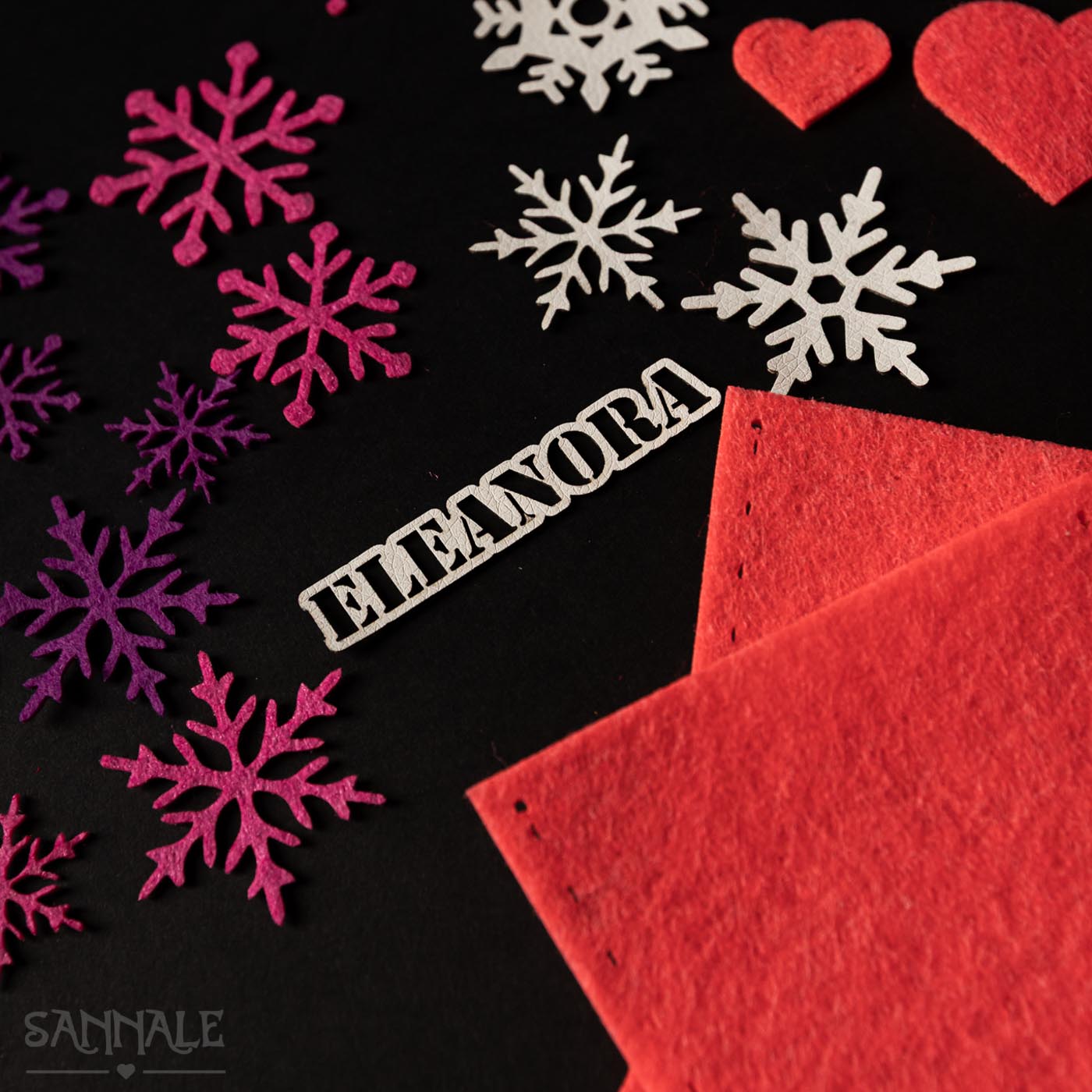 • laseriga lõigatud kaunistused – südamed 3 suuruses (kokku 6 tk) ja erivärvilised lumehelbed